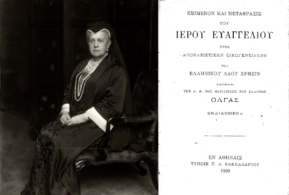 22. Η μεταφραστική προσπάθεια άρχισε το δεύτερο ήμισυ του 1898 από την γραμματέα και έμπιστη συνεργάτιδα της βασιλίσσης Ιουλία Σωμάκη (μετέπειτα Καρόλου). Σύμφωνα με τις μαρτυρίες της Σωμάκη, αφορμή υπήρξε η διαπίστωση που έκανε η βασίλισσα επισκεπτόμενη τραυματίες στρατιώτες του πολέμου του 1897, ότι ο λόγος του Ευαγγελίου ήταν ακατανόητος σε όσους δεν είχαν ανώτερη μόρφωση. Το κείμενο ελέγχθηκε αρχικά από επιτροπή αποτελούμενη από τον Μητροπολίτη Προκόπιο, τον καθηγητή Πανεπιστημίου Ιωάννη Πανταζίδη και τον καθηγητή Θεολογίας Φίλιππο Παπαδόπουλο και εν συνεχεία εστάλη σε καθηγητές της Θεολογικής Σχολής, μεταξύ των οποίων ο Ζήκος Ρώσης, ο Εμμανούλ Ζολώτας, ο Διομήδης Κυριακός. Οι δύο πρώτοι, όπως και οι Γ. Ι. Δέρβος, Ιω. Μεσολωράς και Ιγν. Μοσχάκης υπέγραψαν στις 3.11.1901 το γνωστό υπόμνημα που καταδίκαζε τη μετάφραση του Α. Πάλλη. Εξαίρεση, όπως ήδη αναφέρθηκε, απετέλεσε ο Διομήδης Κυριακός (βλ. ανωτ. σημ. 17), ο οποίος και στην περίπτωση της πρωτοβουλίας της βασιλίσσης Όλγας, διατύπωσε σε επιστολή τη θετική του άποψη σχετικά με το ζήτημα της μετάφρασης («Ἡ ἰδέα νὰ μεταφραστεῖ τὸ Εὐαγγέλιο σὲ γλῶσσα κατανοητὴ στὸν ἑλληνικὸ λαὸ καὶ νὰ διαδοθεῖ σ’ αυτὸν εἶναι ὀρθὴ καὶ πολὺ ὠφέλιμη…. Θὰ συντελέσει σημαντικά στὴ θρησκευτική καὶ ἠθικὴ ἀνάπτυξή του, τὴν ὁποία ἔχει πάρα πολὺ ἀνάγκη… Ἡ Ἐκκλησία μας δὲν εἶναι ἐναντίον τῶν μεταφράσεων βάσει ἀρχῶν..»). Ύστερα από το αίτημα του εκδότη Α. Κωνσταντινίδη να του δοθεί συστατική εγκύκλιος από το Υπουργείο Εκκλησιαστικών και Δημοσίας Εκπαίδευσης, προκειμένου να προχωρήσει στην έκδοση, το θέμα παραπέμφθηκε στον τότε Υπουργό Αντ. Μομφεράτο και εκείνος αρνήθηκε να παραχωρήσει συστατική εγκύκλιο χωρίς την έγκριση της Ιεράς Συνόδου. Η βασίλισσα εξέφρασε το αίτημα να της δοθεί η σχετική έγκριση με επιστολή της προς την Ιερά Σύνοδο στις 2.12.1898. Ύστερα από αρνητική απάντηση που έλαβε στις 31.3.1899, επανήλθε με το ίδιο αίτημα στις 2.5.1899. Υπογράμμιζε, ότι κατανοεί τους λόγους που στο παρελθόν είχαν οδηγήσει στις απαγορευτικές αποφάσεις, όταν οι μεταφράσεις «ἀπέκρυπτον ἴσως προσηλυτιστικοὺς σκοπούς», οι οποίοι όμως στη δική της περίπτωση δεν υφίσταντο. Κατέληγε: «.. ὁ λαός μας στερεῖται τὴν ἐπαρκῆ καὶ ὑγιῆ παρηγοριὰ ποὺ προέρχεται ἀπὸ τὸ Ἅγιο Εὐαγγέλιο. Τοῦτο γνωρίζω θετικὰ ἐξ ἰδίας ἀντιλήψεως καὶ πείρας καὶ εἶμαι βεβαία ὅτι ἡ μετάφραση τοῦ Ἁγίου Εὐαγγελίου θὰ συντελέσει τὰ μέγιστα στὴ ριζική ἀναμόρφωση». Η απάντηση της Συνόδου ήταν και πάλι αρνητική με κύριο επιχείρημα την ανάγκη ανάλυσης και ερμηνείας των Γραφών και όχι κατά λέξιν μετάφρασης του κειμένου. Η βασίλισσα προχώρησε τότε, ύστερα από προφορική άδεια του Μητροπολίτη και με δικά της έξοδα, στην έκδοση κατ’ αρχήν 1000 αντιτύπων, τα οποία θα πωλούνταν έναντι μικρού τιμήματος. Τα αντίτυπα σφραγίστηκαν με τον λογότυπο «Πλανᾶσθε μὴ εἰδότες τὰς Γραφάς». Η διάθεσή τους είχε μεγάλη απήχηση και η βασίλισσα ετοιμαζόταν για δεύτερη έκδοση, η οποία όμως ματαιώθηκε λόγω των Εὐαγγελικῶν. Βλ. την αφήγηση της Ιουλίας (Σωμάκη) Καρόλου, Όλγα – Η Βασίλισσα των Ελλήνων, Αθήνα 1934 (ανατ. 2017), σ. 89-123. ↩︎